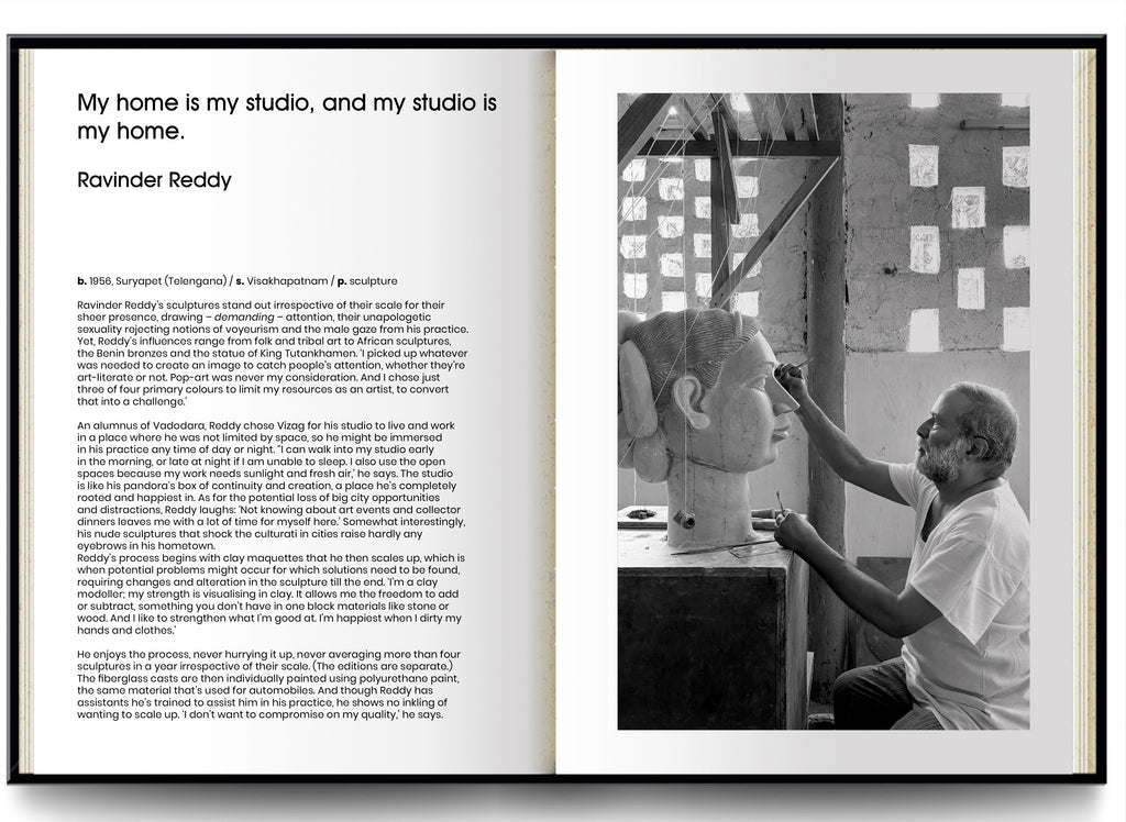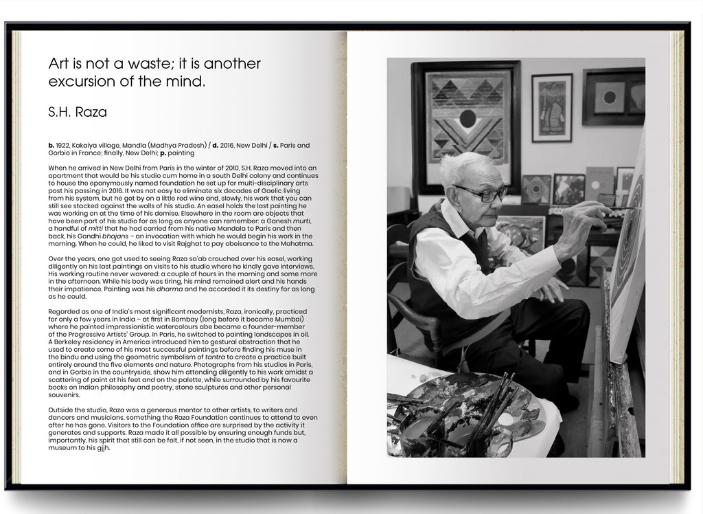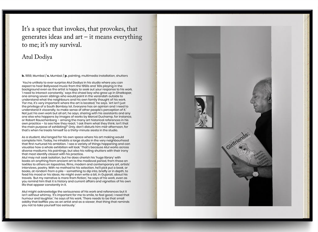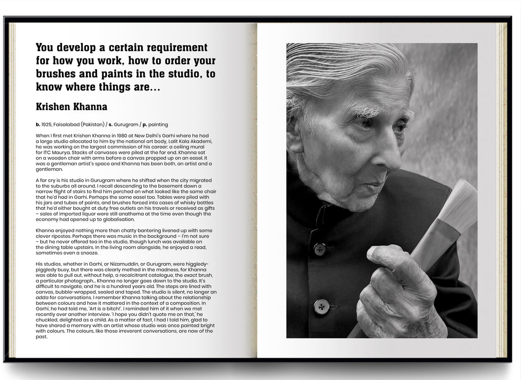 Accompanying Chawla into this private realm is yet another interloper: the author, Kishore Singh, who has known and interacted with these artists over the years as a curator and art historian. Singh unravels the unique relationship the artists have with their studio and work. Together, through the photographs and interviews, situating the artists in their studios, they capture a fleeting moment of truth that forms the subject of this book. For an artist’s studio is both a place of refuge away from the world and the world itself. It is here they overcome their fears and vulnerabilities and turn the inward gaze on what is precious to themselves—slowly, excitingly bringing art to life.